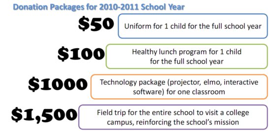 If you'd like to know what your donations can do to help our students, here is a list of donation packages: